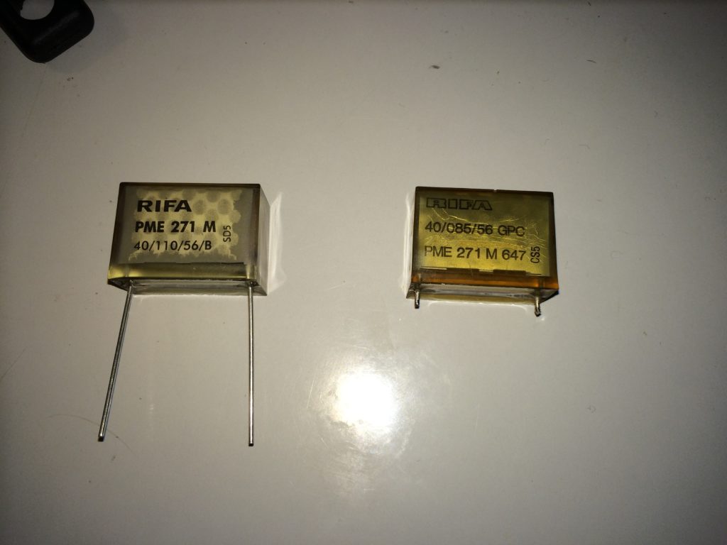 Cédric a commandé une capacité équivalente à celle présente dans le Macintosh qui date de 1984. Chance incroyable, le composant reçu est un modèle identique à l'original, et de la même marque, 30 ans après. Ces capacités de déparasitage sont reliées sur le 230V. Avec le temps, elle ont tendance à s'ouvrir et produisent une fumée blanche et nauséabonde.