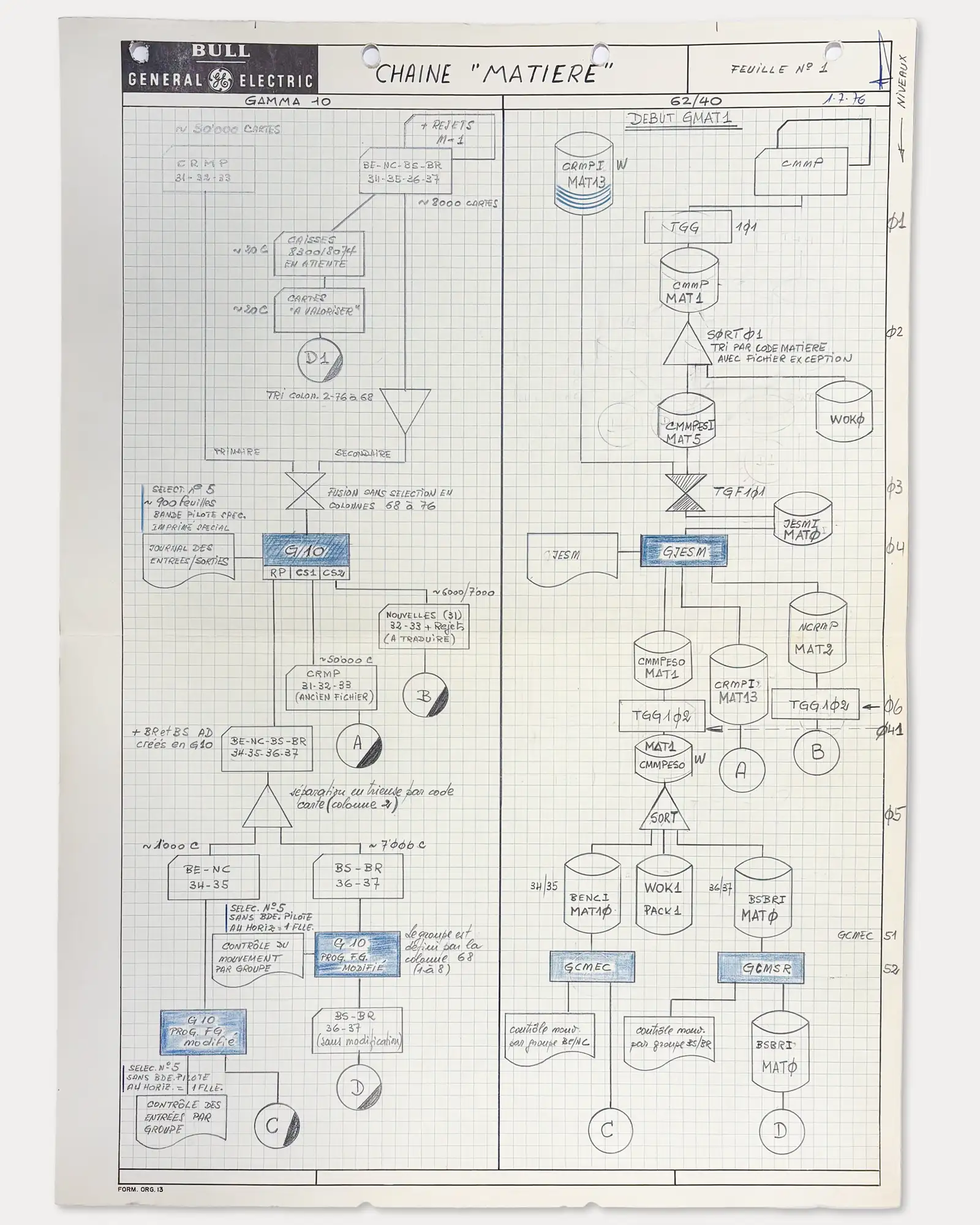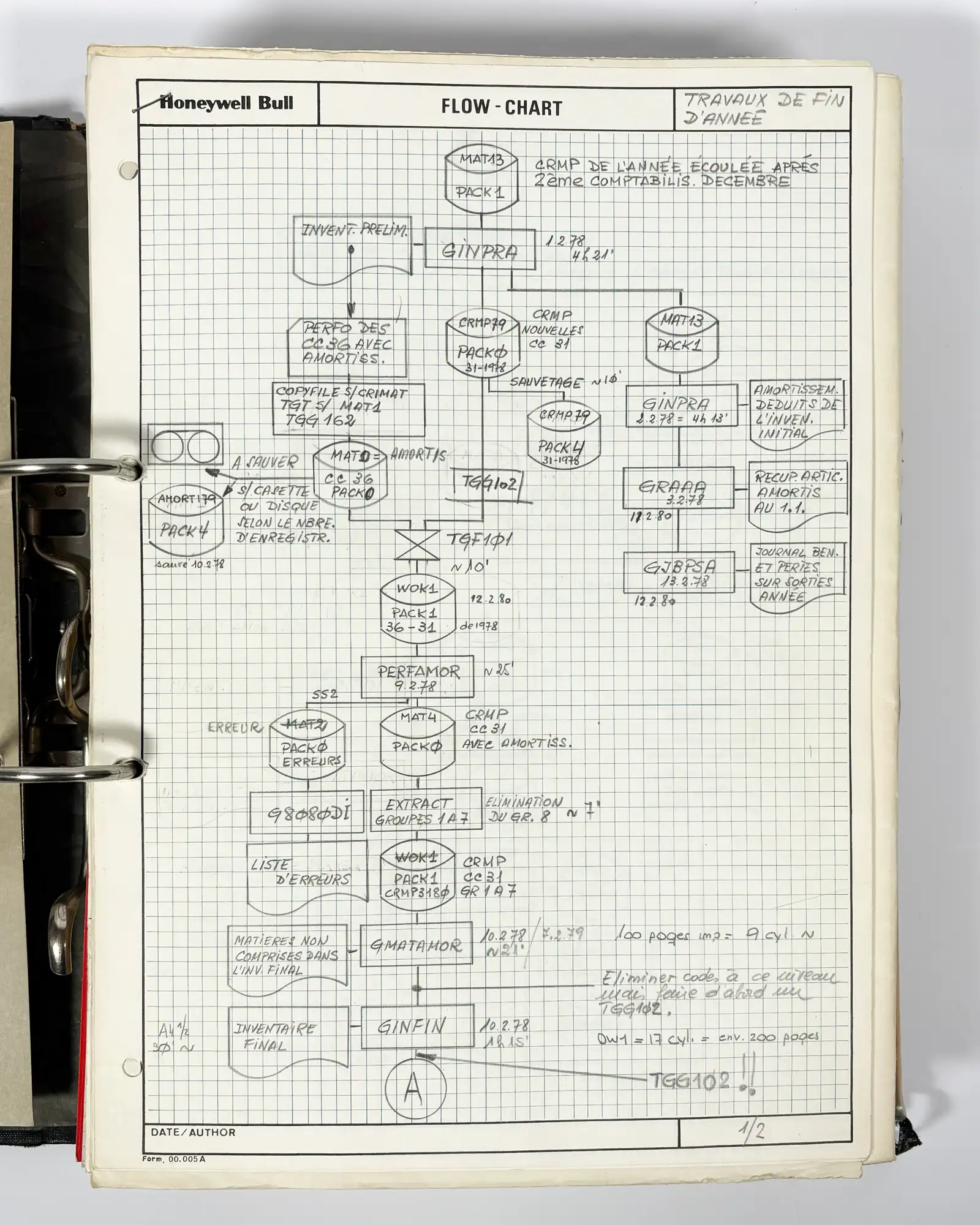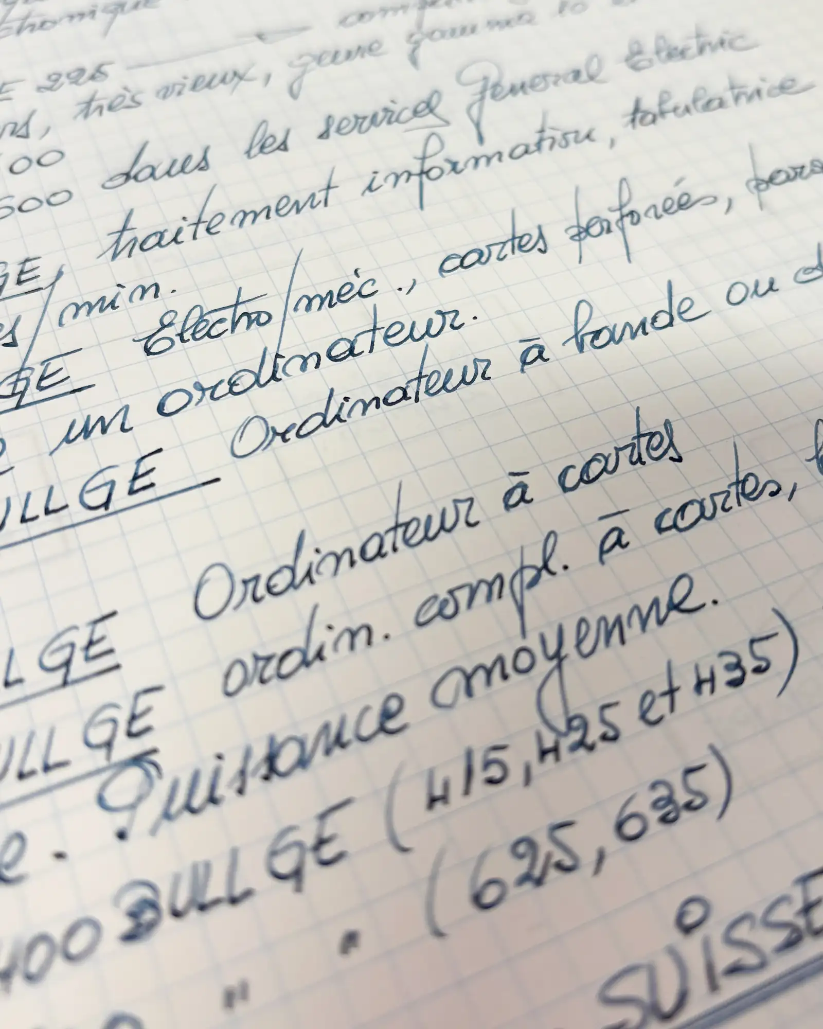 M. M., opérateur, programmeur et comptable, aujourd’hui retraité, a fait don au Musée Bolo d’une perforatrice manuelle Bull (en fonte) de General Electric, ainsi que de son classeur fédéral regroupant l’ensemble de son travail de l’époque. On y découvre des documents rédigés à la main avec une écriture remarquable, des schémas précis dessinés manuellement, des pages de cours annotées, de nombreuses observations techniques, ainsi que quelques spécimens de pièces rares, comme les cartes à bords perforés.