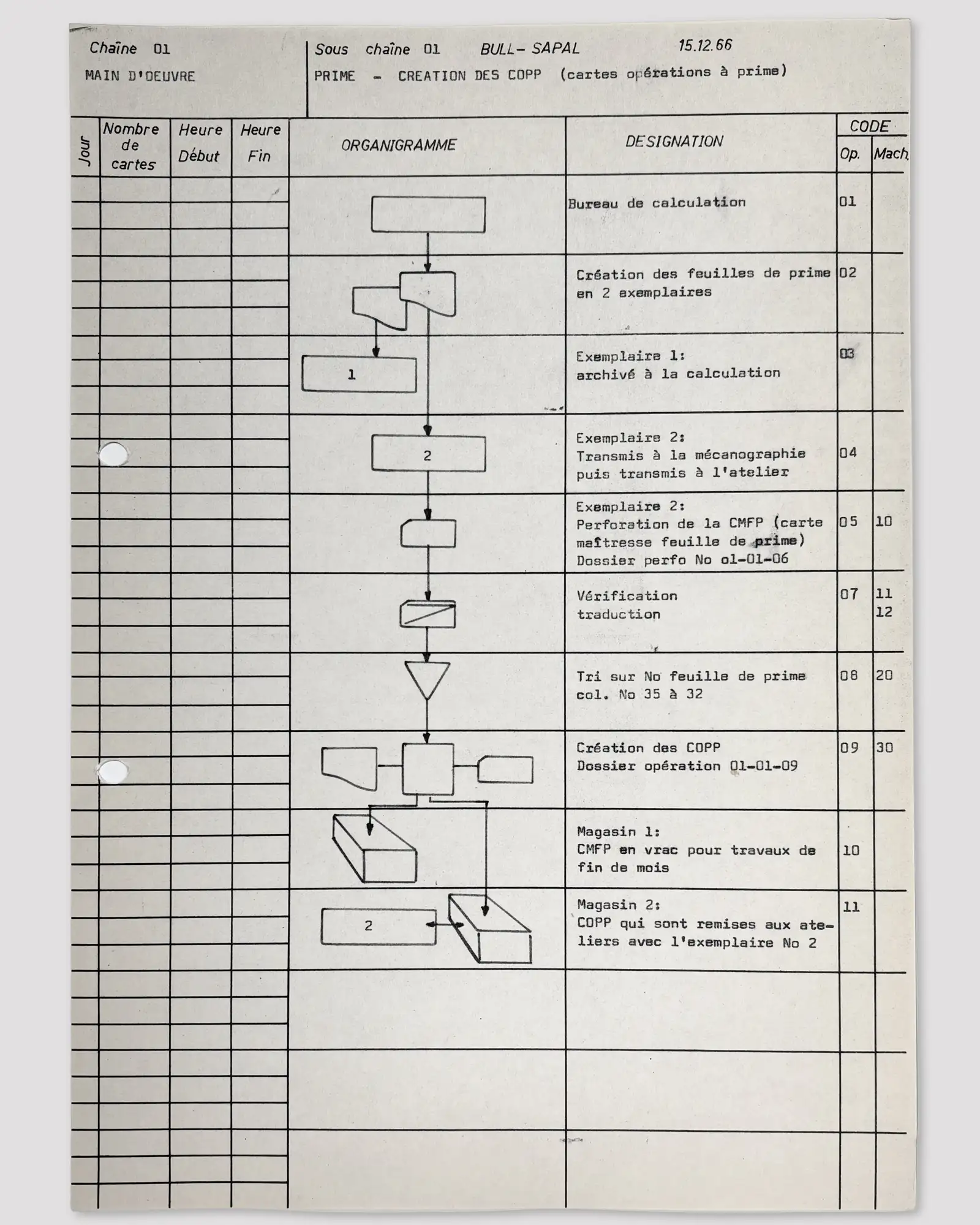 Ces cartes, laborieusement triées à la main, étaient saisies par des mécanographes sur des machines comptables et imprimées par ces mêmes machines sur les différents documents, prix de revient, heures travaillées, etc.