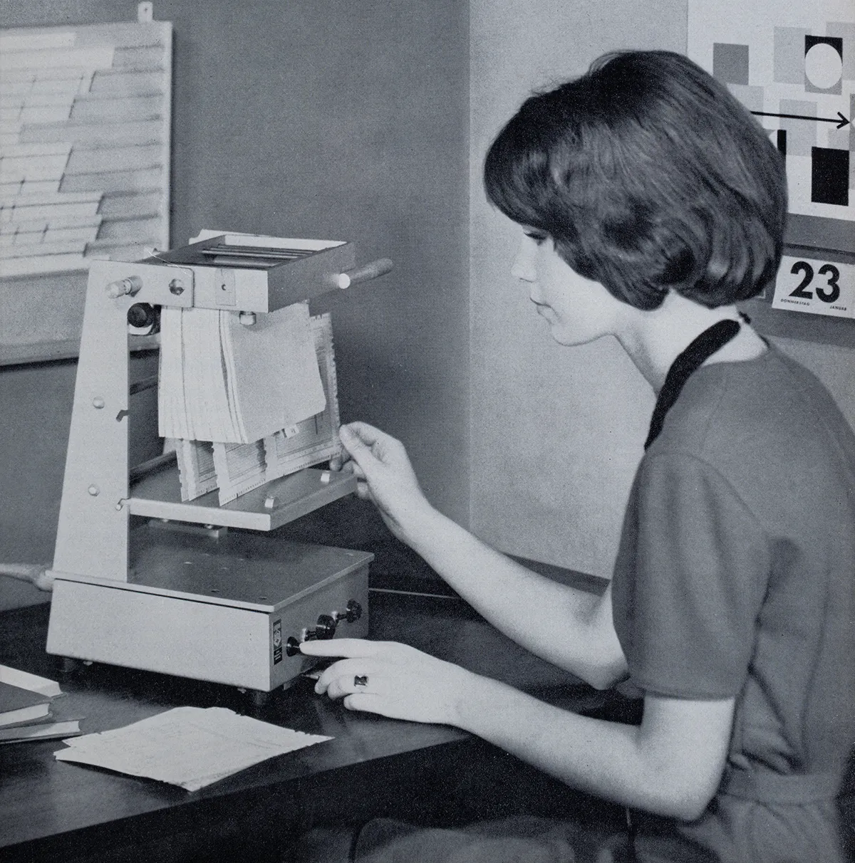 Les informations arrivent au service de perforation des cartes. Les opératrices de mécanographie, préalablement formées à ces nouvelles machines, encodent les données sur des cartes perforées à l’aide d’une poinçonneuse électrique Bull PELEROD. Une seconde opératrice reprend ensuite ces cartes pour vérifier le travail de sa collègue à l’aide d’une vérificatrice VINOD, afin de contrôler l’exactitude des perforations. Les deux machines sont distinctes: l’une perfore, l’autre ne fait que vérifier.