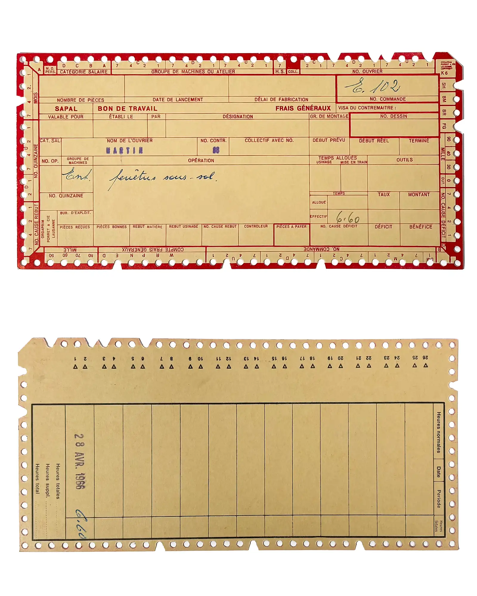 Le système de cartes à perforations marginales EKAHA permet de suivre le travail en atelier. Chaque carte correspond à un employé et à une période donnée: on y inscrit les opérations effectuées, les heures travaillées, la quantité de matière utilisée, etc.