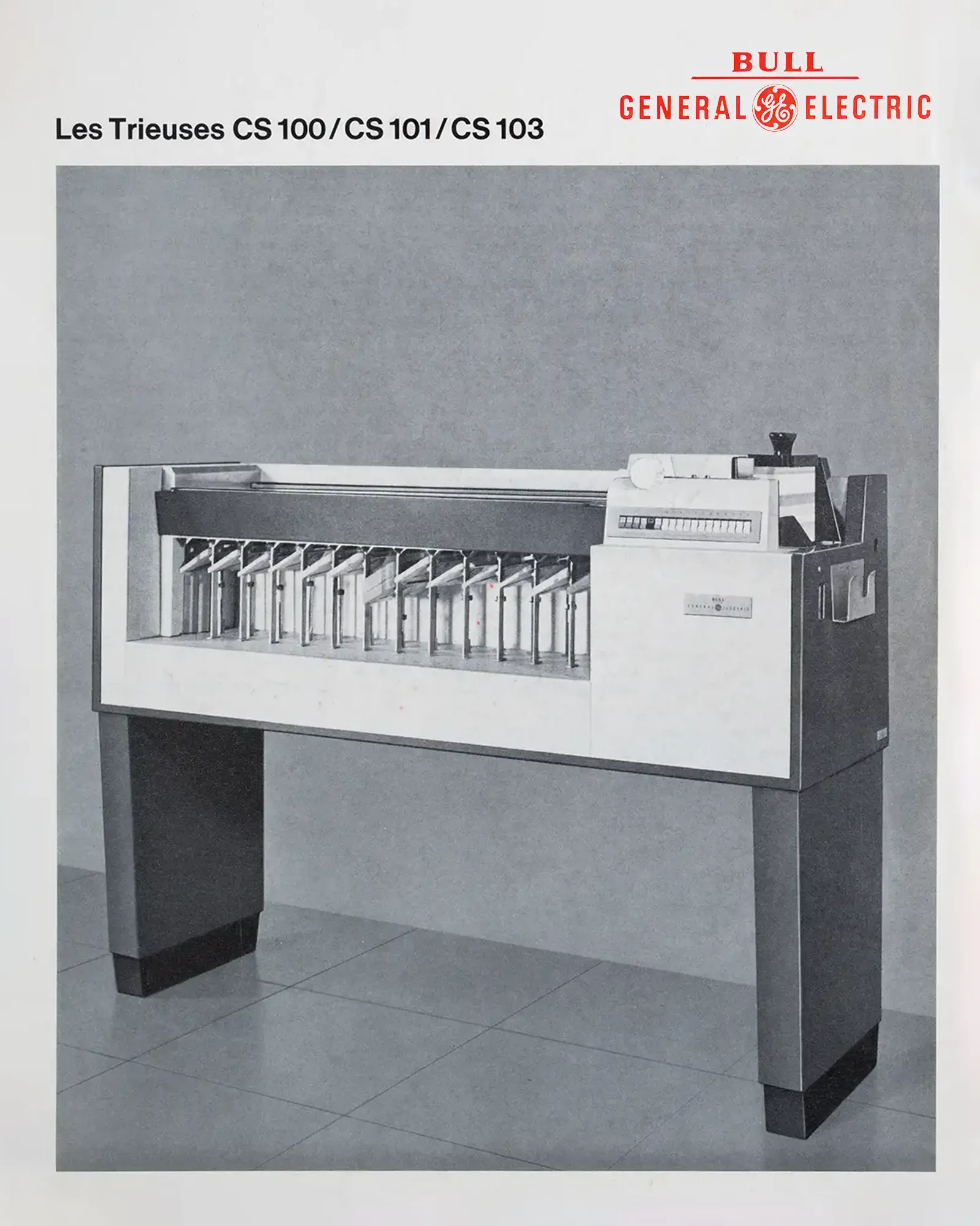 La trieuse de cartes CS100 de Bull, composée de treize compartiments, trie les cartes selon leur nature: heures de travail, matières utilisées, ou autres catégories.