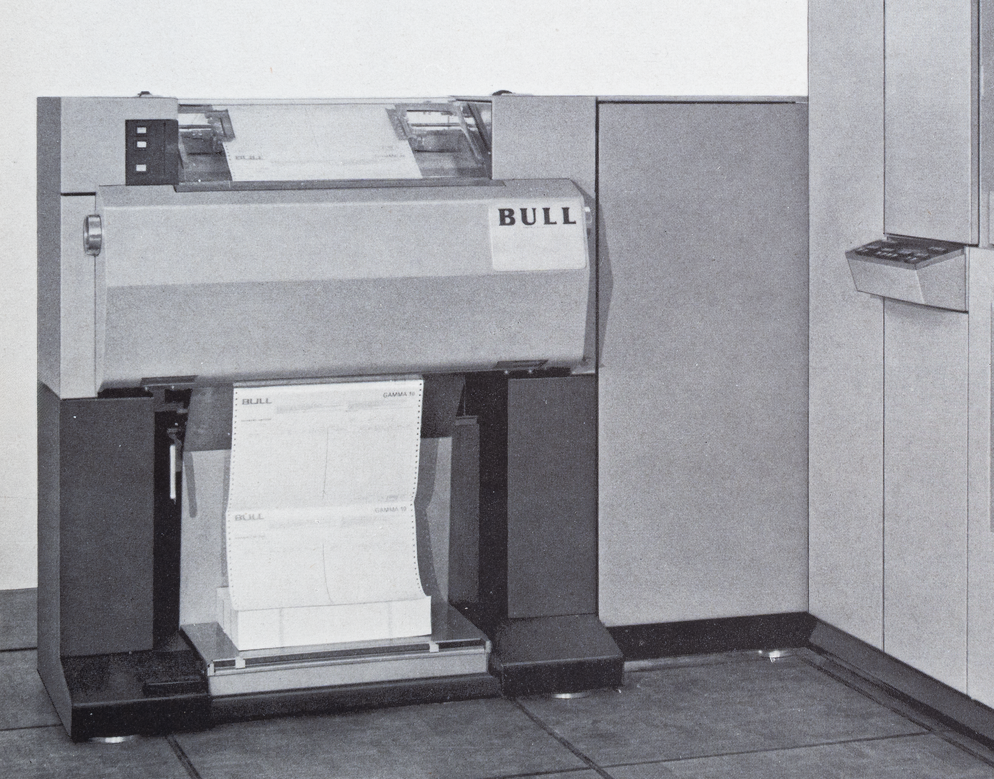 L’imprimante du Gamma 10 atteint une cadence de 300 lignes par minute. Son tambour d’impression, muni de caractères en relief frappés par des marteaux synchronisés, imprime les résultats avec une précision remarquable: bulletins de paye, états des stocks de matières, prix de revient, etc. Les alignements et les sauts de page sont commandés par un ruban perforé, lu automatiquement par une cellule de l’imprimante.
