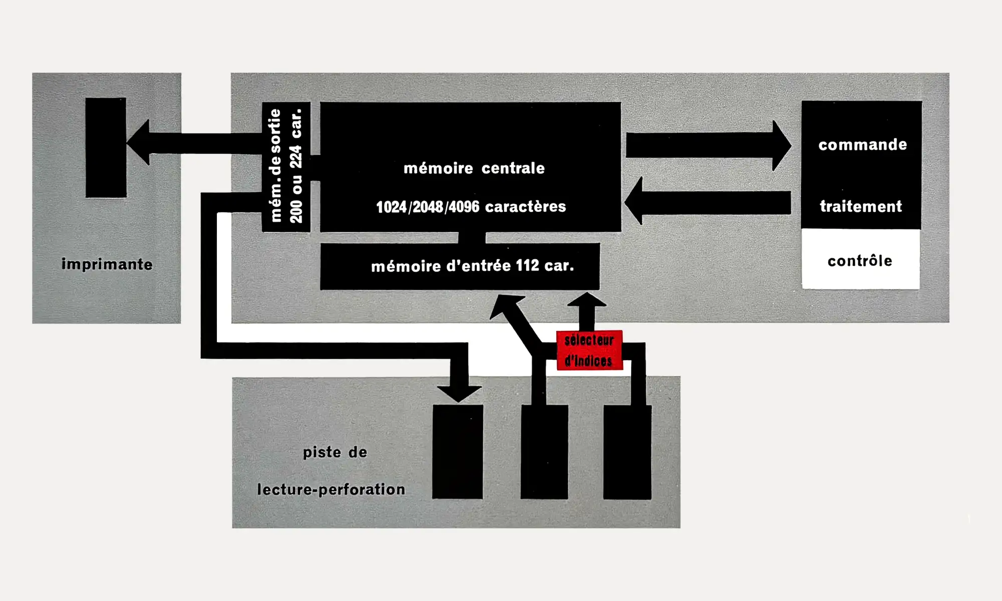 L’unité centrale de calcul constitue le cœur du système. Elle exécute les instructions contenues dans les programmes en effectuant les opérations arithmétiques et logiques nécessaires. Étroitement liée à la mémoire centrale, elle traite les données stockées et coordonne les échanges avec les périphériques d’entrée et de sortie. Sa conception modulaire et sa rapidité d’exécution font du Gamma 10 un outil performant pour les besoins des entreprises de l’époque.